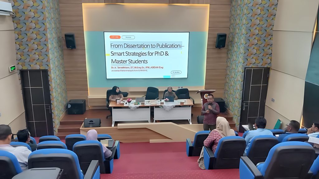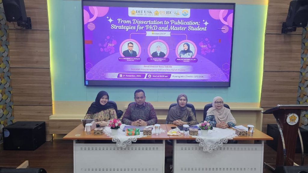 Banda Aceh, 21 November 2025 — Dosen Universitas Muhammadiyah Aceh (Unmuha), Dr. Ir. Tamalkhani, ST., M.Eng.Sc., IPM., ASEAN Eng., yang juga menjabat sebagai Wakil Dekan I Fakultas Teknik Unmuha, hadir sebagai narasumber pada Workshop bertajuk “From Dissertation to Publication: Strategies for PhD and Master Students”. Kegiatan ini diselenggarakan oleh Program Studi Doktor Ilmu Teknik (DIT) Sekolah Pascasarjana Universitas Syiah Kuala (USK).